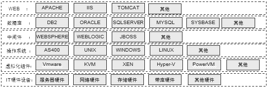 包括WEBSPHERE、WEBLOGIC、TOMCAT、JBOSS、APACHE、IIS等